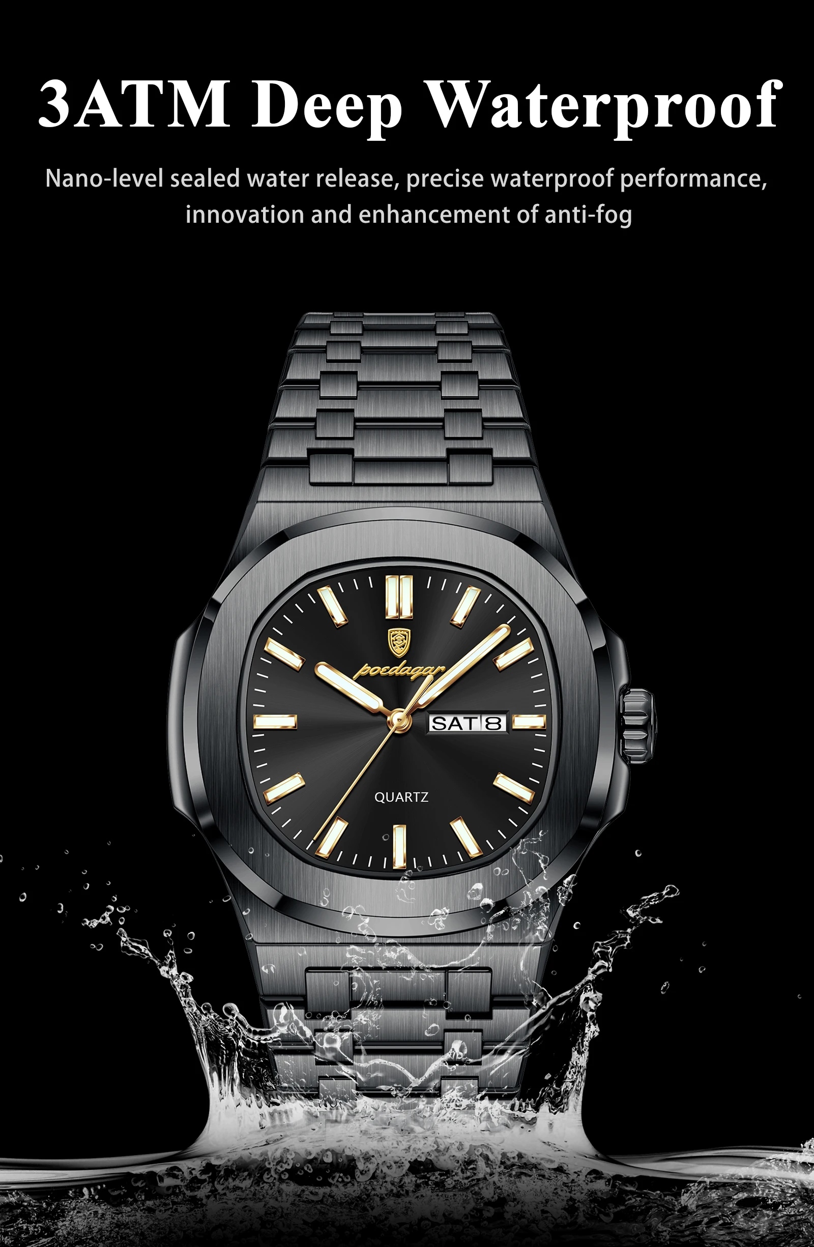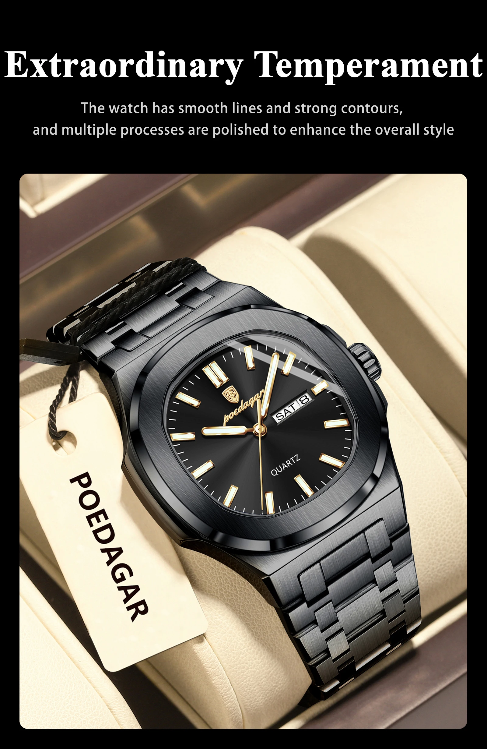 POEDAGAR Brand Square Men's Watch Week Date Stainless Steel Male Watch Luminous Waterproof Luxury Fashion Quartz Watches For Men